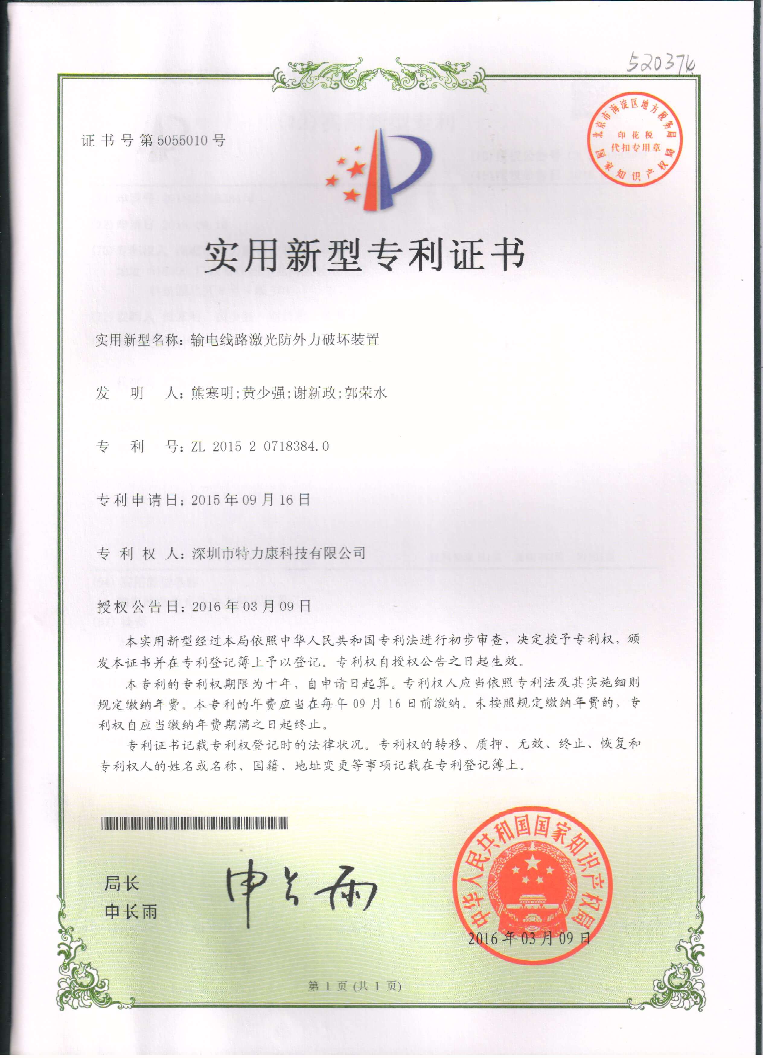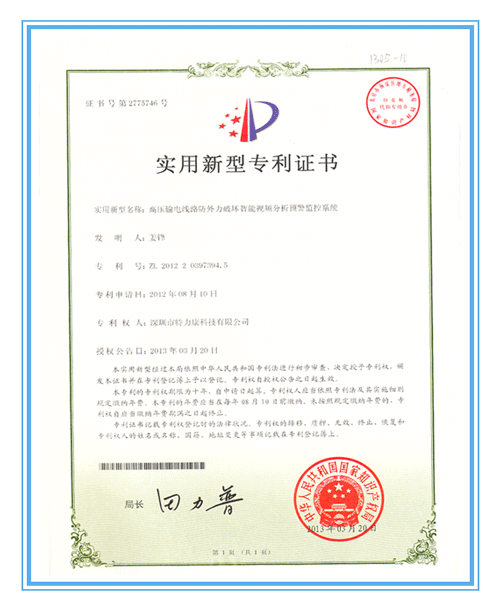 - 輸電線路激光防外力破壞裝置專利認證