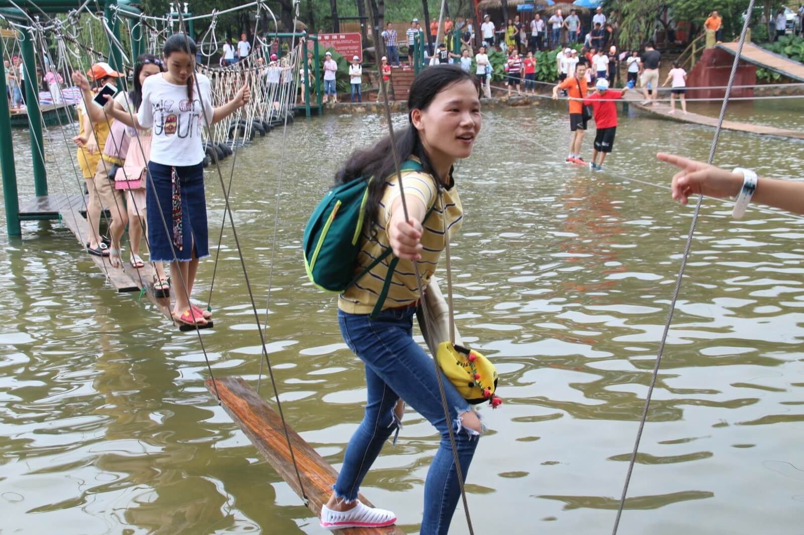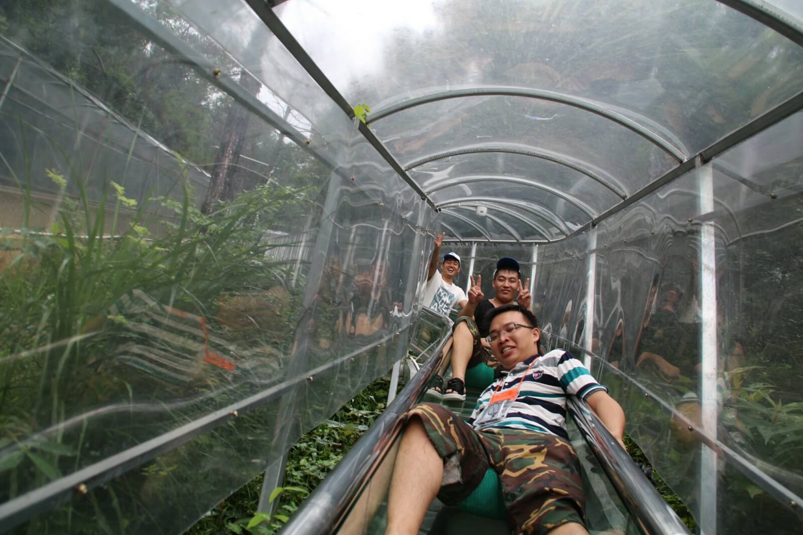 大約經過半小時的登山,便抵達了驚魂玻璃橋及與之相依的飛龍滑道,驚魂玻璃橋的空中廊橋全長接近200米,懸空離地180米左右,對于有恐高癥的人來說,不畏是一處挑戰自我的好地方。不過,再怎么害怕,再通過全長達500多米的飛龍滑道到達山下之后,也就不存在了,長長的滑道可是讓我們重新體驗了一把童年的滑梯享受。另外,景區還設有水上樂園、空中漂流及水上拓展項目。