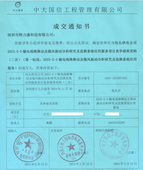 依據評審小組評審意見及推薦,經公示無異議,確定我司為包頭供電公司2023-5-5輸電線路舞動及微風振動分析研究及監測系統應用服務項目競爭磋商采購(二次) (第一標段: 2023-5-5 輸電線路舞動及微風振動分析研究及監測系統應用服務)的成交人,具體內容如下: