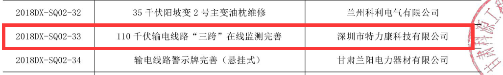 2018年6月4日國網(wǎng)定西供電公司2018年第二批授權(quán)項(xiàng)目談判采購工作已結(jié)束,經(jīng)評審委員會評審,將評審結(jié)果公示。我司為標(biāo)國網(wǎng)定西供電公司2018年第二批授權(quán)項(xiàng)目談判采購2018DX-SQ02-33我標(biāo)包(110千伏輸電線路”三跨”在線監(jiān)測完善)的中標(biāo)單位。