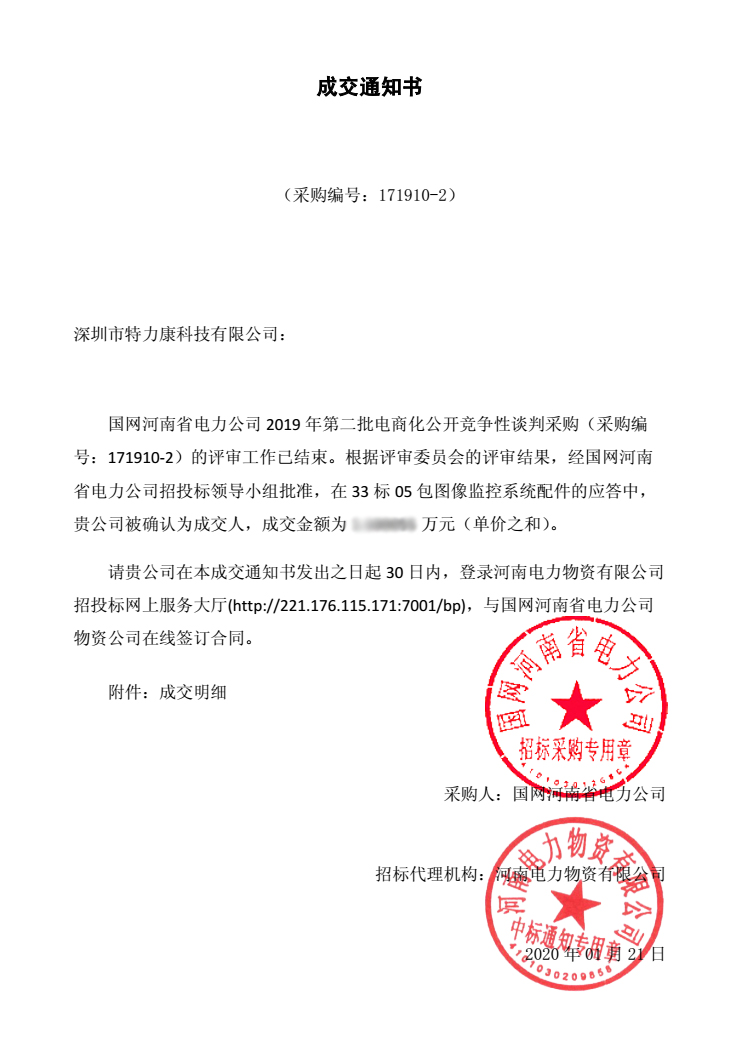 國網河南省電力公司2019年第二批電商化公開競爭性談判采購(采購編號: 171910-2) 談判工作已結束,經評審委員會評審,并報公司招投標工作領導小組批準,我司中標國網河南省電力公司2019年第二批電商化公開競爭性談判采購33標05包圖像監控系統配件及34標03包圖像監控系統接口板,中標通知如下: