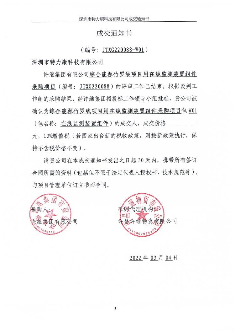 許繼集團有限公司綜合能源竹羅線項目用在線監(jiān)測裝置組件采購項且(編號: JTX6220088)的評審工作已結(jié)束。根據(jù)談判工作組的采購結(jié)果,經(jīng)許繼集團招投標(biāo)工作領(lǐng)導(dǎo)小組批準(zhǔn),貴公司被確認(rèn)為綜合能源竹羅線項且用在線監(jiān)測裝置組件采購項目包W01(包名稱:在線監(jiān)測裝置組件)的成交人,成交通知如下: