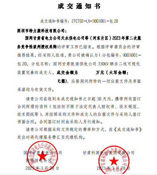 國網(wǎng)甘肅省電力公司天水供電公司等(河?xùn)|片區(qū)) 2023年第二次服務(wù)競爭性談判授權(quán)采購的評審工作已結(jié)束。根據(jù)評審委員會(huì)的評審?fù)扑]結(jié)果,經(jīng)采購人批準(zhǔn),我司被確認(rèn)為(分包編號: 9003001-包20,分包名稱:國網(wǎng)甘肅隴南供電公司330KV曬杏二線可視化裝置完善的成交人,成交通知書如下: